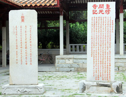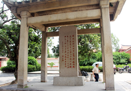 曾任中国人大常委会副委员长、中国科学院院长的现代文化名人郭沫若曾于1962年秋季参观泉州开元寺。至今在开元寺东侧准提禅寺山门前西侧园圃,设置他所手书《咏泉州》诗碑。此碑高2.5米,宽1米。落款为“一九六二年咏泉州,郭沫若”,行草写道: “刺桐花谢刺桐城,法界桑莲接大瀛。 石塔双擎天浩浩,香炉独剩铁铮铮。 亚非自古多兄弟,唐宋以来有会盟。 收复台澎今又届,乘风破浪待群英。” 笔者在开元寺内信步观景时,无意之中走入尊胜院,也看到了弘一法师纪念馆。可惜的是当时这座纪念馆大门紧闭,附近也没有管理员或服务生,笔者不得而入,只能把这座弘一法师纪念馆存入照相机镜头。 弘一法师是近代高僧,也是中国新文化运动先驱之一,据说,他圆寂后遗骨葬于泉州清源山和杭州虎跑寺,然而他一生中的最后14年在泉州生活的史料、照片、著作和墨宝皆陈列于弘一法师纪念馆之内。