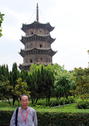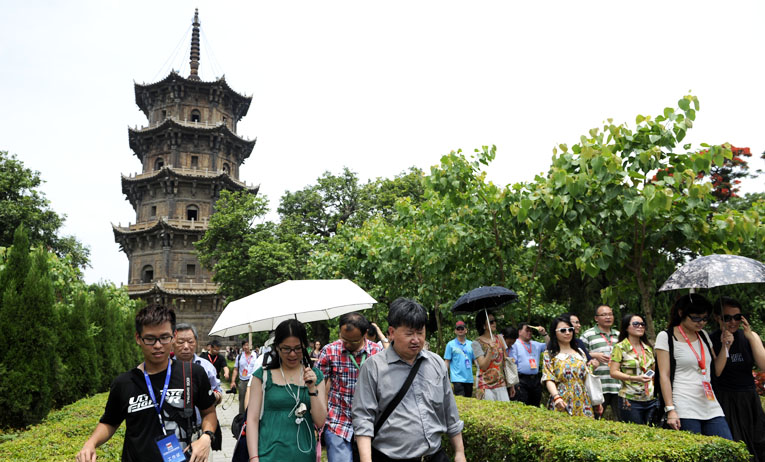 石塔不但坚固无比,而且造型精致。塔檐呈弯弧状向外伸展,檐角高翘,使塔身有凌空欲飞的态势,显得轻盈。每一层塔壁上还刻有十六幅浮雕,分别刻有人天乘,声闻乘、缘觉乘、菩萨乘和佛乘,共计80幅栩栩如生的人物雕像,而且刀工细腻,线条流畅,巧夺天工。 西塔名为仁寿塔。根据史籍,五代梁贞明三年(公元917年)王审知由福州泛海运木来泉州建此塔,最初取名为“无量寿塔”。后来在北宋政和四年(公元1114年),由宋徽宗赵佶赐名“仁寿塔”,前后经过毁坏与重修多次,易木为砖,至宋绍定元年至嘉熙元年(公元1228-1237年)才由自证法师易砖为石,先于东塔十年建成。西塔通高44.06米,略低于东塔,其规模与东塔几乎完全相同。 根据佛教的说法,东塔代表人间娑婆世界,“娑婆”的意思是“堪忍”,指人类世界灾难深重,不堪忍受。西塔代表西方极乐世界,是佛教所向往的净土。 笔者在现场上观察,第七期海外华文媒体高级研修班学友们及其他游客,似乎更喜欢在东塔附近流连观赏、拍照,也许就是因为他们更喜欢人间娑婆世界吧? 东塔镇国塔是释迎牟尼佛的象征,塔的束腰部分雕刻四十幅佛本生故事,有太子出游、沙门示相、钵降火龙、经乘白马等表现佛陀成道、传布佛法的内容。