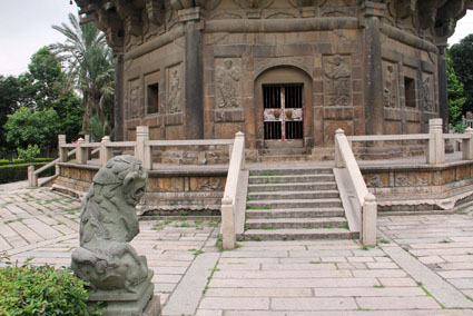 左塔的须弥座上刻着:“右南厢梁安家室柳三娘,舍钱造宝塔二座,同祈平安。绍兴乙丑(绍兴十五年,1145年)七月题。王思问舍钱三十贯,乙酉重修。” 实际上,这双波罗门金涂式石塔是复制品,原来的石塔已被坍塌的百年古树压碎。 根据资料,1982年8月,台风刮倒泉州开元寺拜庭的巨榕,榕树压倒石塔。后来,塔中清理出五代时期泉州刺史王继勋等善信捐资雕刻的佛顶尊胜陀罗经幢。又清理出银质鎏金观音像,背面刻“泉州右南厢宣明坊女弟子柳三娘,与夫主梁安共舍宝塔一座,并永充供奉。 大殿后面,我们在中轴线的第二个台阶上就可看到戒坛,这是佛教徒受戒的地方,这种神秘肃穆的氛围,令人敬畏,令人看破红尘,令人一心皈依。而这里的戒坛也称为“甘露戒坛”。据说,唐代此地经常降甘露,有一位叫行昭的和尚就在这里挖了一口井,井水清澈,且甜如甘露。直至北宋天禧三年(公元 1019年),后人在井上建坛,因此称为甘露戒坛。 越过戒坛之后就看到藏经阁,这里的藏经阁也称为“百宝楼”,表示珍藏佛家宝典之处。据悉为元代至元二十二年(公元1285年),僧录刘鉴义建造的。元、明时期已经过多次重修,至民国十四年(公元1925年)圆瑛和尚改建为水泥仿木结构的二层楼阁。