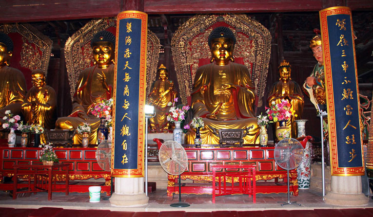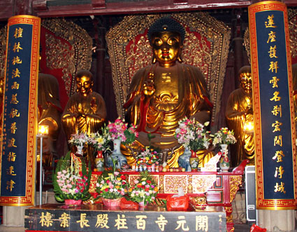 大雄宝殿在主体建筑的中轴线上,也称为紫云大殿。大殿上方巨匾写着“桑莲法界”四个魏碑风格的大亨,以应传说中 “桑开白莲”的故事。 根据传说,泉州在唐朝初期已成为盛产丝绸的地方。这片土地原是大财主黄守恭的桑树园,有一天,黄守恭梦见一位僧人向他募地建寺,这位大财主说要等桑树开出白莲花后就献地结缘。神奇的是几天之后,满园桑树果然都开出白莲花,黄守恭深深为无边佛法感动,果然把这片桑树园捐献出来。 虽然这只是神奇的传说,却为当地居民津津乐道,世代相传,年深日久,也使到开元寺获得“桑莲法界”的美称。 大雄宝殿始建于唐朝垂拱二年(公元686年),也称为“百柱殿”。先后经过唐、南宋、元、明几次受灾与重建,现存建筑物是明代崇祯十年(公元1637年)遗物。大殿通高20米,面宽九间,进深六间,面积达1387.75平方米,大殿出拱深远,外观雄浑,保存唐朝宏模巨制、巍峨壮观的建筑风格。 大雄宝殿满堂都是佛像,我们犹似进入天界佛国。笔者知识浅薄,对佛教认识不足,竟觉得许多佛像都很相似,但又略微有所差异,若问有何不同之处,却说不出其所以然,但若要打破沙窝问到底,也只能以一句话概括:“含有一股相同的佛气”。