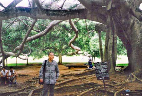 根据《大般涅盘经》记载,释迦牟尼涅盘后,留有4 枚佛牙,一枚被帝释(笔者按:俗称玉皇大帝)请往天上供奉,一枚被捷疾罗刹(笔者按:俗称阎罗王)请走,其余二枚留于人间。在人间的两枚佛牙,一枚现在斯里兰卡佛牙塔供奉,被称为“锡兰佛牙”,一枚现在北京西山灵光寺的佛牙塔供奉,被称为“法现佛牙”。 甘迪市一年一度的佛牙寺庆典(约在公历七月下旬,当地称为 Esala Perahera)非常热闹隆重,该市连续十天晚上,举办盛大的游行,每天都闹到深夜。游行时,先由数位赤膊大汉挥舞着长鞭,霹霹雳雳打在石砖路上,发出巨响开道,接着是举着火炬的队伍,随后是一队又一队敲锣打鼓的乐队,再来是近百只披挂着镶满宝石锦绣华布的大象,其中便有顶着神龛的大象,龛上装饰着五颜六色的小灯炮。但是,神龛里装着的是复制的佛牙。 根据导游的解释,佛牙是斯里兰卡的“国宝”,锡兰国王Kthsirinevan(公元301年至328年)重视佛教的力量,当时的印度国王深表钦佩和感动,于是把他最聪慧的公主嫁给Kthsirinevan,并赠予此佛牙。后人为了纪念这位下嫁锡兰国王的公主,至今在佛牙寺侧旁还保留着她的塑像。自最后一个王朝失去佛宝之后,斯国都一直被英国所统治;最后才在英国找回佛牙,并由英国政府在1853年交回甘迪佛牙寺珍藏。据说,这枚神圣的佛牙是释迦摩尼的左上角犬牙。佛牙不但永不出寺门,而且每数年到十年不等,才会开放给民众朝拜,每次都有来自斯里兰卡各地以及世界各国的佛教徒前来参拜,人数也达上百万人。 我注意到日本游客很关心斯里兰卡佛教的寺庙,在这几天的行程中,我已经遇到两支以专访斯国各地寺庙为主要目的之旅游团,他们的人数各有10余人。 周恩来亲手栽种的树 一树成林奇景。 观光团游佛牙寺的节目被安排在晚上,因此我们先到甘迪市著名的皇家植物园。Peradeniya植物园面积有16.8公顷,收集了各种各类4000余种珍奇花木,其中的腊叶馆收藏了柑橘亚科腊叶约200种。我们抵达时又刚好下了一阵子雨,这许多树木在获得雨水之后更显现出欣欣向荣的气息。 斯里兰卡全年气候温和,没有台风、大雨、地震,可谓地球上少数不受天然灾害国家之一。整个国家覆盖着浓密森林、椰林或美丽的梯田茶园,植物园这片广大的林园自然有许多稀罕珍贵的花草树木,这里有一棵巨大的榕树,此树不少枝桠已经“自立门户”长出一些带根的树干,甚至这些树干也长出许多“另谋发展”的枝桠了,这棵 “携子带孙”的大树竟然组成方圆近百米的榕树阵! 植物园有高达30米的瘦长椰树,这是斯里兰卡的特种椰树;有粗筒的、细筒的长得高达20余米的青竹,有出污泥浊水而依旧洁白的莲花,也有世上罕有的拿破仑王冠树,最有价值的是这里有一片由各国政要来访时栽种树木的园林,有中国首任总理周恩来亲手栽种的树。 斯国天然风景触目可见。
