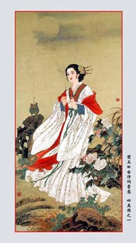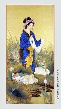 西施浣纱--沉鱼 春秋战国时期,越国有一个叫西施的,是个浣纱的女子,五官端正,粉面桃花,相貌过人。 她在河边浣纱时,清彻的河水映照她俊俏的身影,使他显得更加美丽,这时,鱼儿看见她的倒影,忘记了游水,渐渐地沉到河底。 从此,西施这个“沉鱼”的别号,在附近流传开来。 昭君出塞--落雁 汉元帝在位期间,南北交兵,边界不得安静。 汉元帝为安抚北匈奴,选昭君与单于结成姻缘,以保两国永远和好。 在一个秋高气爽的日子里,昭君告别了故土,登程北去。一路上,马嘶雁鸣,撕裂她的心肝;悲切之感,使她心绪难平。 她在坐骑之上,拨动琴弦,奏起悲壮的离别之曲。 南飞的大雁听到这悦耳的琴声,看到骑在马上的这个美丽女子,忘记摆动翅膀,跌落地下。 从此,昭君就得来“落雁” 的代称。 。 貂蝉拜月--闭月 三国时汉献帝的大臣司徒王允的歌妓貂婵在后花园拜月时,忽然轻风吹来,一块浮云将那皎洁的明月遮住。 这时正好王允瞧见。 王允为宣扬他的女儿长得如何漂亮,逢人就说,我的女儿和月亮比美,月亮比不过,赶紧躲在云彩后面。 因此,貂婵也就被人们称为“闭月”了。 贵妃醉酒--羞花 唐朝开元年间,有一美貌女儿叫杨玉环,被选进宫来。 杨玉环进宫后,思念家乡。 一天,她到花园赏花散心,看见盛开的牡丹、月季,想到自己被关在宫内,虚度青春,不胜叹息。 她对着盛开的花说:“花呀,花呀!你年年岁岁还有盛开之时,我什么时候才有出头之日?”。声泪俱下,她刚一摸花。花瓣立即收缩,绿叶卷起低下。 哪想到,她摸的是含羞草。这时,被一宫娥看见。 宫娥到处说,杨玉环和花比美,花儿都含羞低下了头。“羞花”称号由此得来。 |